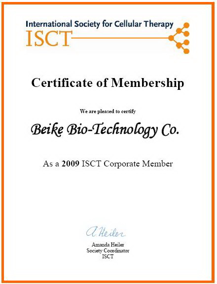 2009年8月,北科生物獲得國際細(xì)胞治療協(xié)會(huì)(International Society for Cellular Therapy,ISCT)會(huì)員資格,并獲得了該協(xié)會(huì)頒發(fā)的會(huì)員證書,成為該機(jī)構(gòu)的正式會(huì)員。